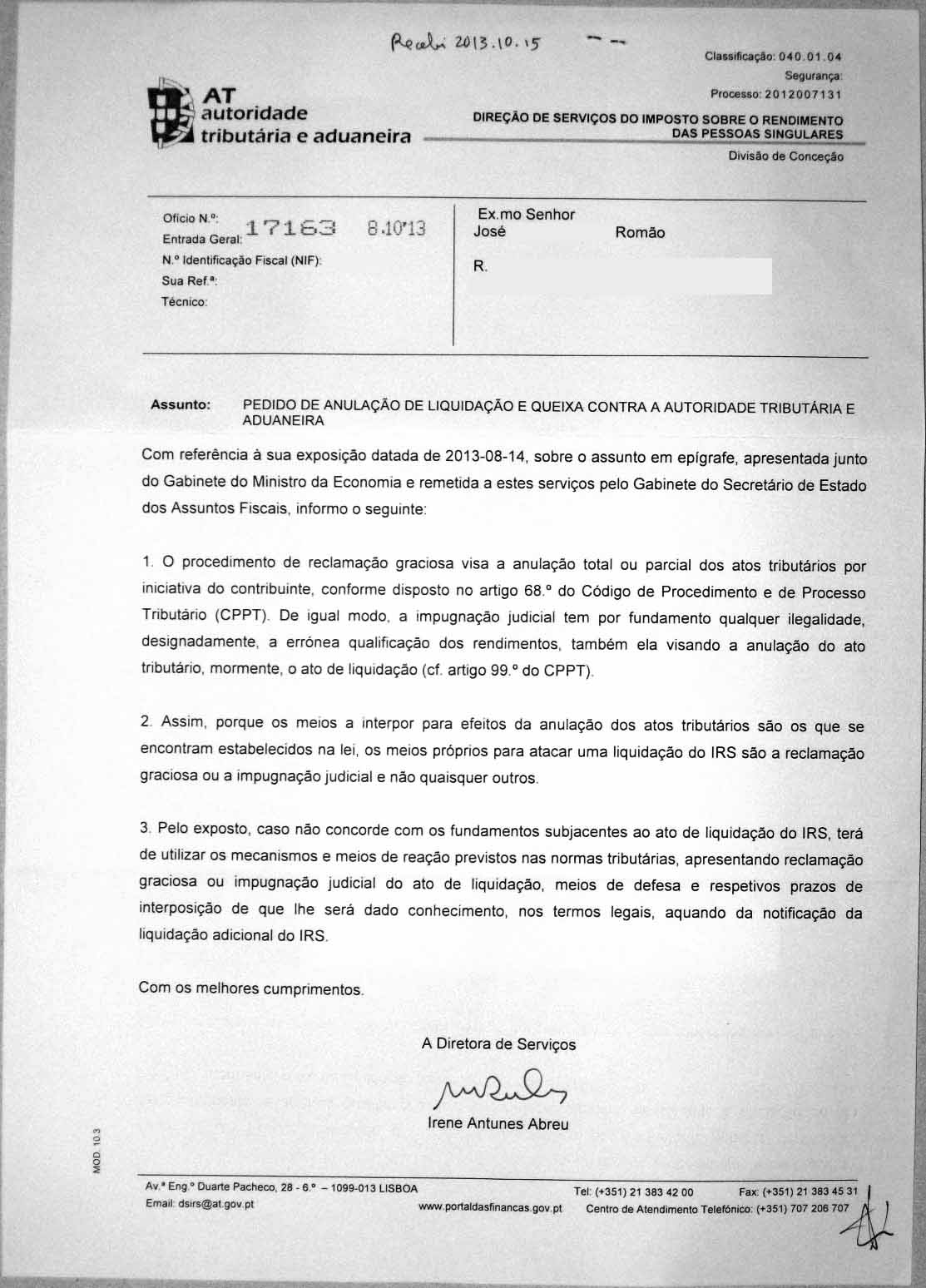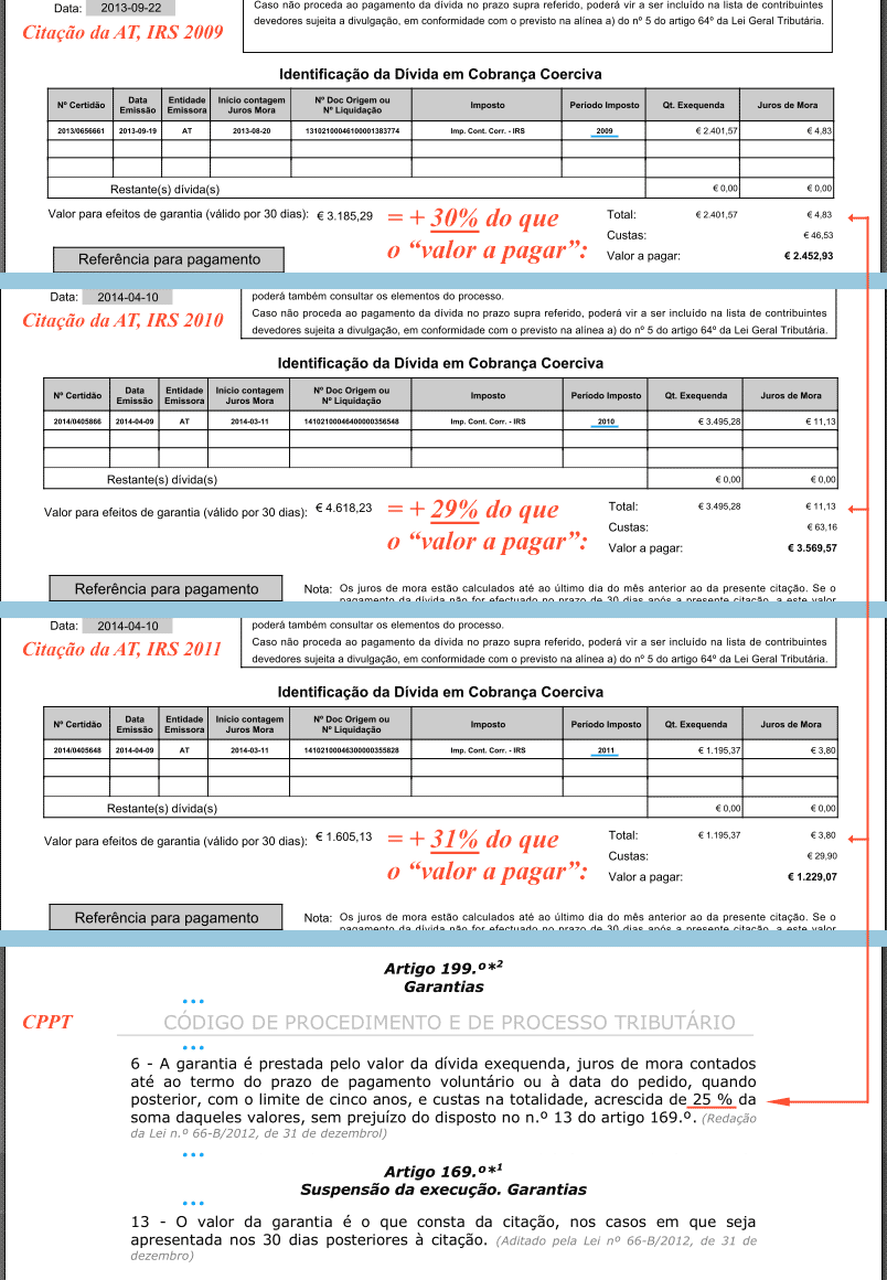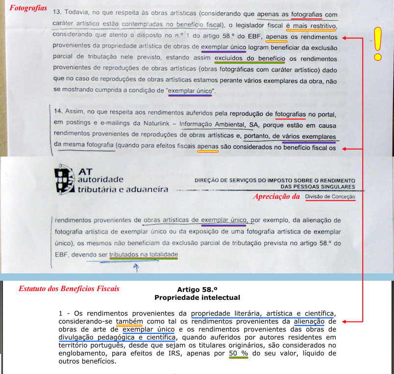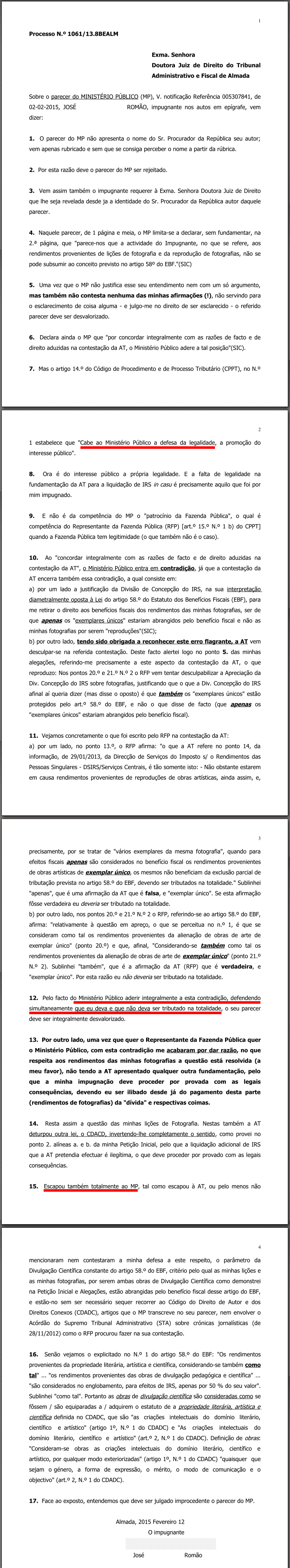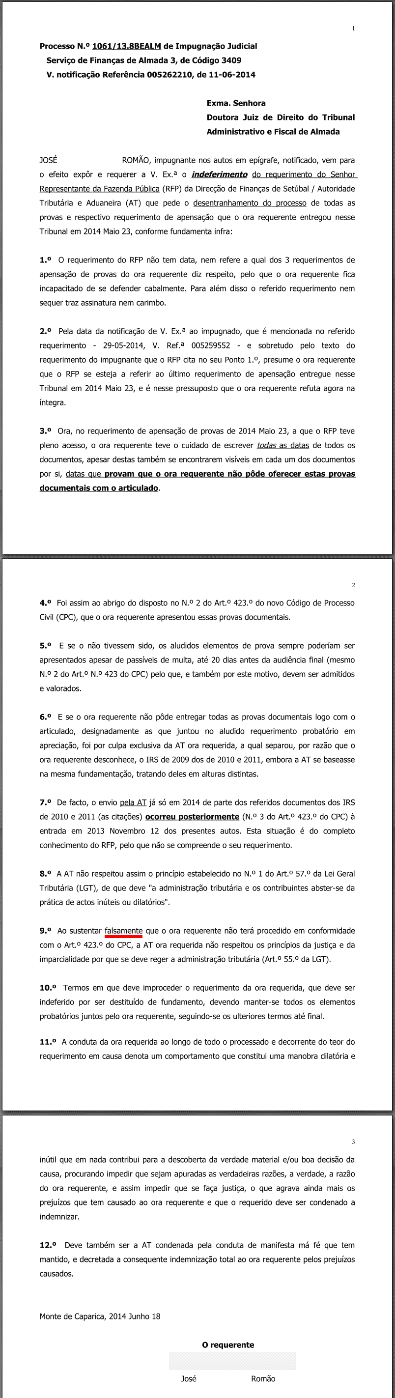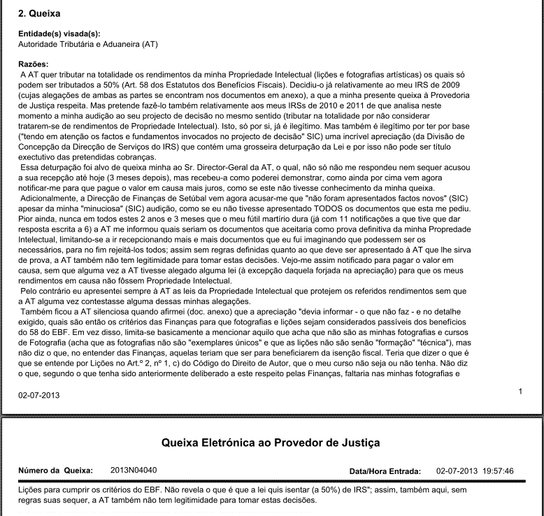 RECUOS DA INJUSTIÇA: 1. Queixa minha contra a AT ao Provedor de Justiça, deu origem ao processo Q-4653/13(A2) a 2013-Jul-11 ![]() 2. Ignorando o meu pedido preventivo à AT de 2013-Nov-04, e só após nova diligência minha de 2014-Jul-29, as Finanças desistiram de penhorar as minhas contas bancárias, mais uma ilegalidade (Art.º 169.º N.º 1 do CPPT) pois eu tinha já entregue à AT as garantias bancárias que esta exigiu e impugnado judicialmente a decisão da AT, o que é suposto suspender a execução fiscal ficando esta a aguardar a decisão do tribunal. 3. Após 2 reclamações minhas, as Finanças restituiram-me em 2015-Mar-02 o reembolso do IRS de 2013 (€236,60), que também ilegitimamente penhoraram (Penhora de Creditos - Processo 3409201401148834) a 2014-Jul-09 e retiveram durante 8 meses; mas ainda não me pagaram os respectivos juros de mora a que tenho direito e que exigi. É ASSIM QUE TRATAM OS EMPRESÁRIOS? Pedido à Ministra das Finanças de anulação da liquidação e queixa contra a AT, de 2013-Ago-14, com cópia para Ministra da Justiça, Primeiro Ministro, Ministro da Economia, Comissão para a reforma do IRC, Partido Social Democrata, CDS - Partido Popular. Mais ilegalidades da AT. Respostas que esta queixa "mereceu": 1) O Ministro da Economia passou para o Ministério das Finanças, pois considerou que não lhe dizia respeito Ler. O Gabinete do Secretário de Estado dos Assuntos Fiscais, recebendo via Ministro da Economia(!), passou para a Directora dos Serviços (signatária da própria apreciação da DSIRS!): que eu faça reclamação graciosa (a qual viria a ser indeferida pela AT) ou impugnação judicial. Ler 2) Ninguém mais respondeu! Porquê? Já sabiam o que se está a passar? O QUE ESTA FANTASIA DAS FINANÇAS GEROU até ao momento: excessivos trabalho (para nada), perda de tempo, de clientes e negócio, de dinheiro e de saúde que já tive em vão (e o Estado também em parte) por causa disto. LISTA DE DOCUMENTOS ATÉ 2015-Set-07 1 - 2011-Mar-21, referente ao IRS2009, 1ª Notificação da Direcção de Finanças de Setubal (DFSetúbal), Ofício Nº 8105, "para ... apresentar ... documentos comprovativos da natureza do rendimentos" (Propriedade Intelectual), 1 página, prazo de 10 dias para responder. 2 - 2011-Mar-31, respondi por escrito (1 página, "IRS 2009 Prop. Intelectual - resposta 002.doc"), com documentos (23 páginas, compreendendo 5 Notas de Honorários, 1 impressão duma pág. Web desse Cliente onde constam fotografias de minha autoria no artigo de Divulgação Científica "Uma visita botânica ao Cabo da Roca", os apontamentos das minhas lições mini-curso livre de Fotografia). Tudo o que bastava para resolver o problema da AT e o caso tería ficado por aqui. a1 - 2011-Mar-31, entreguei a minha resposta acima (e obtive comprovativo de entrega) no Serviço de Finanças de Almada-2 (SFAlmada-2) para seguir para a DFSetúbal. 3 - 2012-Fev-09, IRS2009, 2ª Notificação DFSetubal, Ofício Nº 003694 "para ... apresentar ... elementos/esclarecimentos", "recibos mod. 6, facturas, ... contratos, Outros documentos que considere relevantes", "tendo em vista a análise do ... enquadramento de tais rendimentos" (Prop. Intelectual), 1 página; é uma 2ª notificação porque "não tive conhecimento desta resposta" (a minha resposta anterior, de 2011 Março 31) como afirmaria a Sra. Técnica Judite Lourinho da DF Setúbal na reunião a 2012-Fev-23. Prazo de 10 dias para apresentar os elementos/esclarecimentos. 4 - 2012-Fev-23, reunião na DFSetúbal a meu pedido, com a Técnica Judite Lourinho, onde expliquei oralmente e entreguei documentos (18 páginas, compreendendo o comprovativo de entrega à AT a 2011-Mar-31 da minha resposta anterior (de 2011-Mar-31), contrato de transmissão de Direitos de Autor das minhas fotografias, cursos realizados em 2009, 7 eMails com Clientes das contas ds minhas Lições, extracto bancário, livro de Fotografia "Cabo da Roca" de que sou autor, meu registo da marca Mil Cores, para a Técnica da AT fotocopiar o que quis) diferentes dos que tinha apresentado em 2011-Mar-31, mais a minha resposta anterior (de 2011-Mar-31) e enviei ainda um eMail com um resumo das contas. Compareceu também a minha contabilista que apresentou documentos adicionais da minha actividade: recibos mod. 6 ("verdes") e facturas. 5 - 2012-Fev-23, pedi e trouxe declaração da Técnica Judite Lourinho "Não tive conhecimento desta resposta até à presente data 2012-Fev-23" (a minha 1ª resposta, de 2011-Mar-31), "IMG_2415_GrSc Fin Setubal n recebeu de Almada.jpg", 1 página. 6 - 2012-Fev-23, pedi e trouxe declaração da Técnica Judite Lourinho "...José ... Romão se deslocou a esta Direcção de Finanças, hoje, ... onde prestou esclarecimentos relacionados com os rendimentos ... IRS ... de 2009 ... da propriedade intelectual, tendo fornecido vários documentos comprovativos, como sendo ... .", "IMG_2416 DeclarFinSetubal estive la' 120223.jpg", 1 página. __________ 7 - 2012-Jun-18, IRS2011, 1ª Notificação da Directora de Serviços, Direcção de Serviços do IRS (DSIRS), GIC1/002351159, ID.DOCUM. 20121498000002351159 Divergências de IRS: "Os rendimentos isentos de propriedade intelectual declarados são superiores aos conhecidos", 1 página. 8 - 2012-Jun-29, entreguei 10 páginas de documentos no Serviço de Finanças Almada-3 (SFAlmada-3, acompanhado da minha contabilista. 9 - 2012-Jun-29, pedi e trouxe comprovativo de comparência nas Finanças dentro do prazo dado "Esteve presente neste Serviço de Finanças Almada-3 em 29/6/2012" para "prestar os devidos esclarecimentos", "EstiveCosta120629 DEF11_220.jpg", 1 página. 10 - 2012-Jul-10, respondi por escrito (1 página, 4 pontos com alíneas justificativas, incluindo por alguns clientes não me fornecerem o seu NIF), com documentos (18 páginas), "IRS 2011 Prop. Intelectual - resposta 001.doc". a2 - 2012-Jul-10, entreguei a resposta acima no SFAlmada-3 para seguir para a DFSetúbal e 